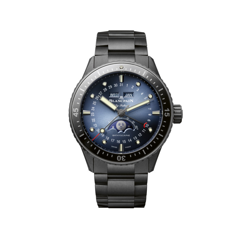 Blancpain Fifty Favors Bathyscaphe Calendario completo Orologio in ceramica con fasi lunari, $ 46.000.