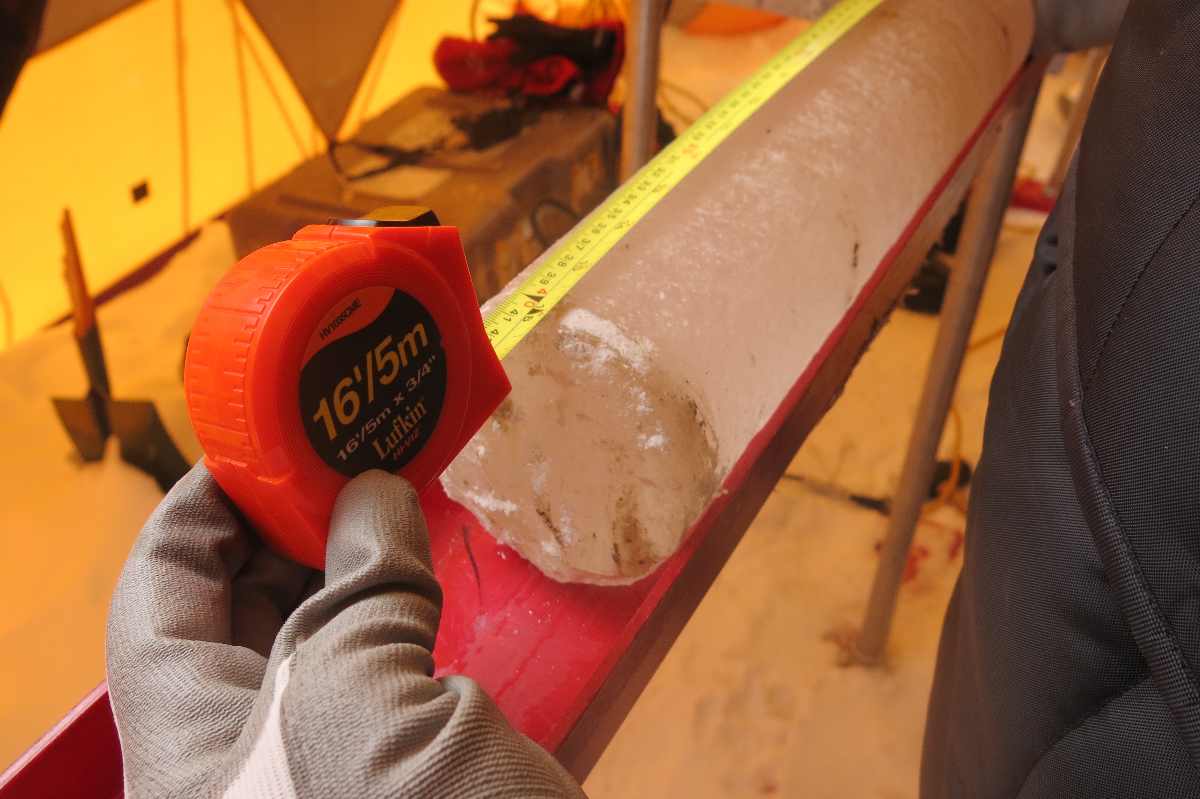 Utilizzando una macchina speciale che mantiene la carota in un unico pezzo all’interno della trivella, è stato accuratamente perforato un cerchio largo 10 cm, a più di 300 metri di profondità nel ghiaccio, corrispondenti a 41.000 anni di storia.