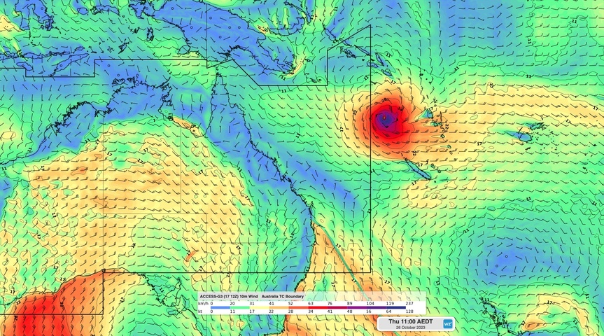Immagine: previsioni di velocità e direzione del vento alle 11:00 EDT di giovedì 26 ottobre 2023, secondo il modello ACCESS-G, che mostrano un potenziale ciclone tropicale vicino al confine orientale dell’area di responsabilità dell’Australia.