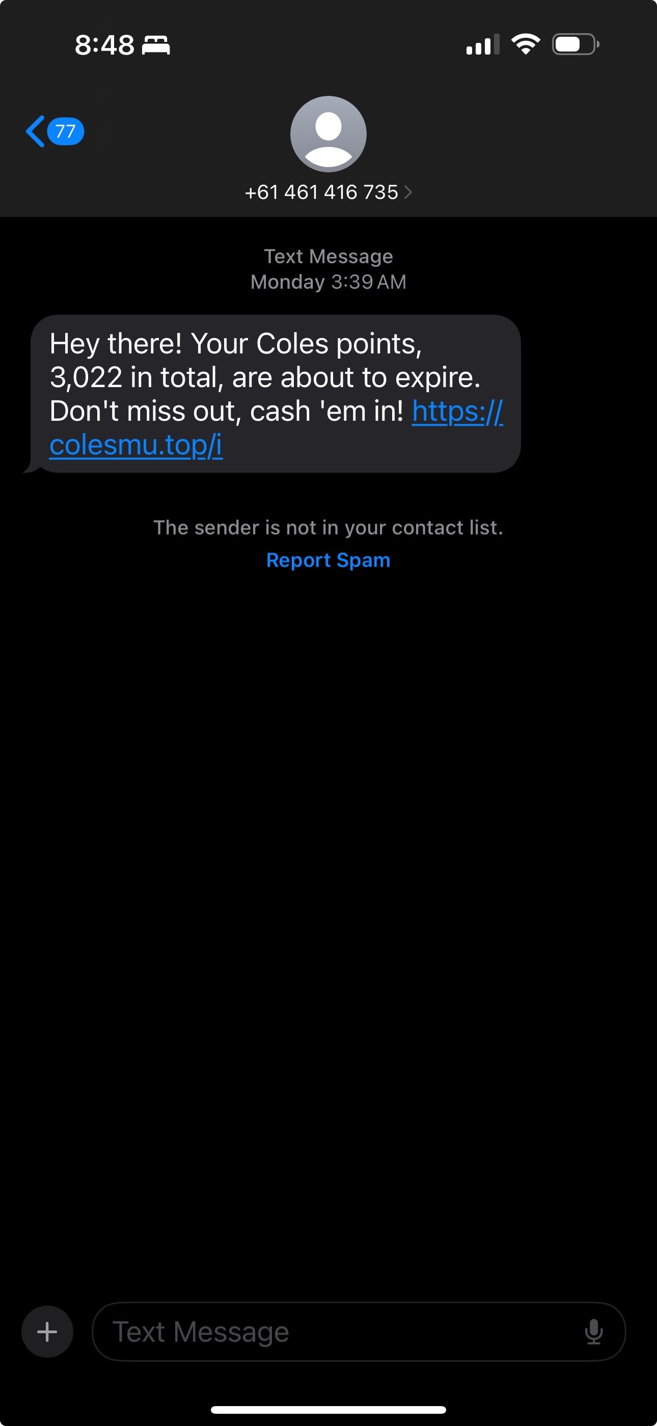 Il mese scorso, Coles ha confermato che il messaggio di testo “3022 punti” era una truffa di phishing e non era stato inviato dal colosso dei supermercati.
